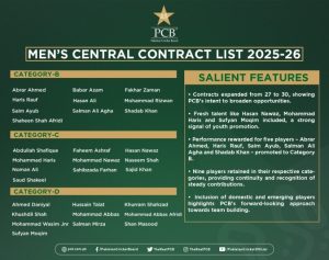 Lahore, August 19, 2025:The Pakistan Cricket Board (PCB) has announced central contracts for 30 male cricketers for the 2025–26 season. The contracts will run from July 1, 2025, to June 30, 2026. The decision reflects PCB’s continued focus on rewarding national talent and ensuring strong squad depth.