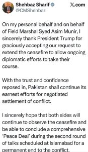 Prime Minister Shehbaz Sharif thanked Donald Trump for extending the ceasefire after Pakistan’s request. He said the decision supports ongoing diplomatic efforts. The move is seen as a positive step toward reducing regional tensions.