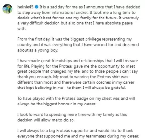 Heinrich Klaasen explained that the retirement decision was made after much reflection and consideration for his personal future and family life. “It took me a long time to figure out what’s best moving forward,” he said.