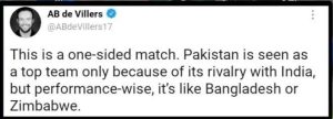 اس خراب کارکردگی کے بعد پاکستان کے کرکٹرز پر تنقید کا سلسلہ جاری ہے، جن میں جنوبی افریقہ کے کرکٹ لیجنڈ اے بی ڈی ویلیئرز بھی شامل ہیں۔ میچ کے بعد ڈی ویلیئرز نے اسے یک طرفہ مقابلہ قرار دیتے ہوئے کہا کہ بھارت کے ساتھ تاریخی حریفوں کی جنگ کے باوجود پاکستان کی پرفارمنس اب بنگلا دیش اور زمبابوے کے برابر ہو چکی ہے۔