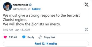 سماجی رابطے کی ویب سائٹ ‘ایکس’ (سابقہ ٹوئٹر) پر خامنہ ای نے دو پیغامات میں کہا کہ جنگ کا آغاز ہو چکا ہے اور صہیونی ریاست پر رحم نہیں کیا جائے گا۔ ان بیانات کو عالمی سطح پر شدید ردعمل کا پیش خیمہ سمجھا جا رہا ہے۔